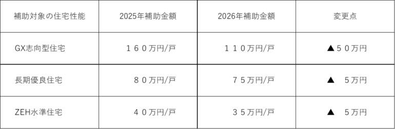 今回発表された2026年度の補助金制度は、昨年の「子育てグリーン支援事業」の流れを汲む、省エネ住宅に対する支援策です。最も注目すべきは、やはり補助金額の変更です。